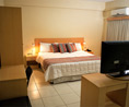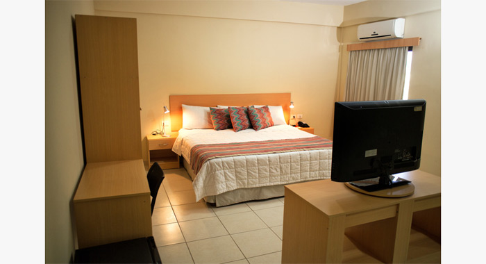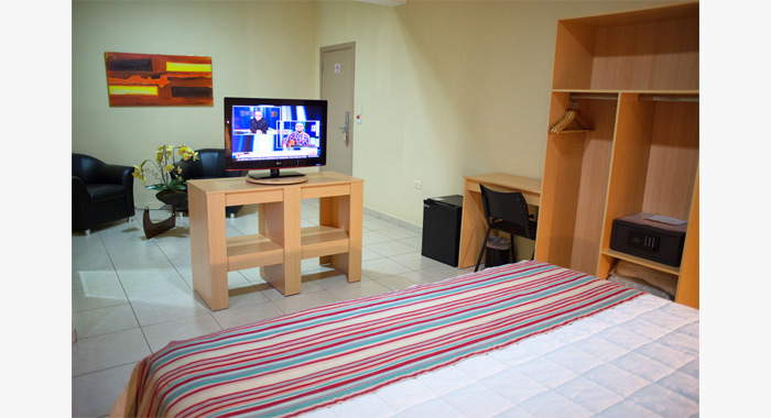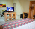 Habitación con una cama King Size y sofá, con TV LCD 32” con acceso a 75 canales por cable, Aire Acondicionado frio/calor, Teléfono DDN-DDI, Cofre de Seguridad, Secador de pelo.
